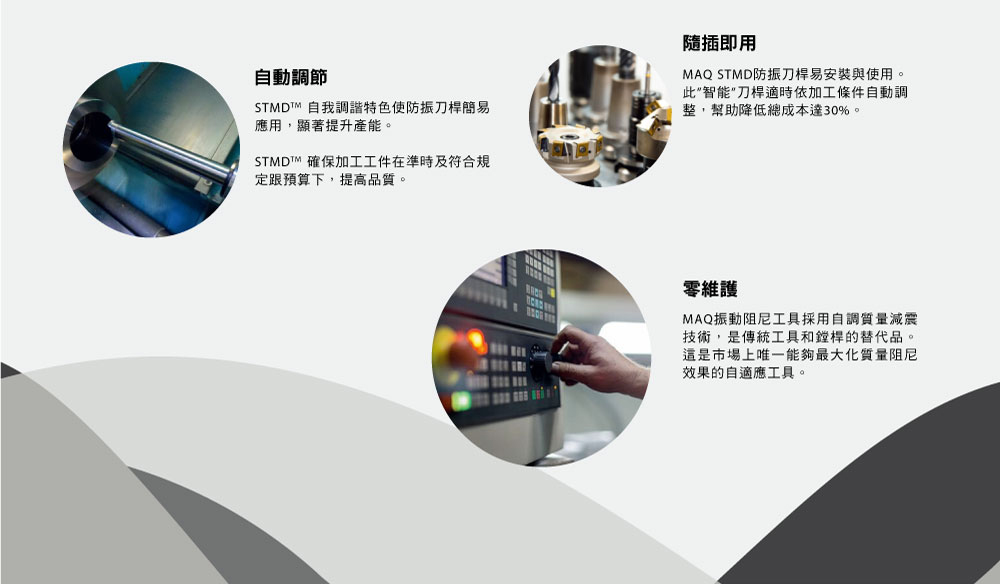 MAQ STMD取自字首Self-Tuning Mass Damper,自我調諧質量阻尼器,刀具開箱後,直接使用改善切削產能 隨插即用、零維護、免調諧